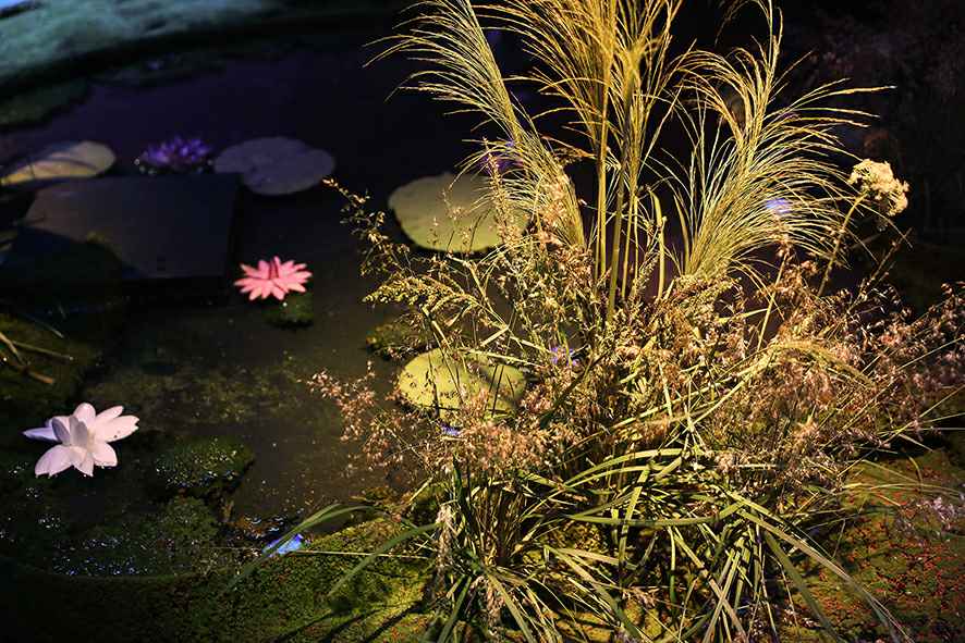 花境溪水涧的东方诗意意境,将舞美、情景剧、影像、音乐进行跨界融合。本次秀演一共分为三幕情景剧,《寻芳记》,《花涧里》,《梦花源》,通过自然与艺术的碰撞,结合最新3D科技的声、光、影等美学视角,营造出时而朦胧,时而真实的五感体验,带领观秀嘉宾们走进充满想象的情景秀无界艺术空间。