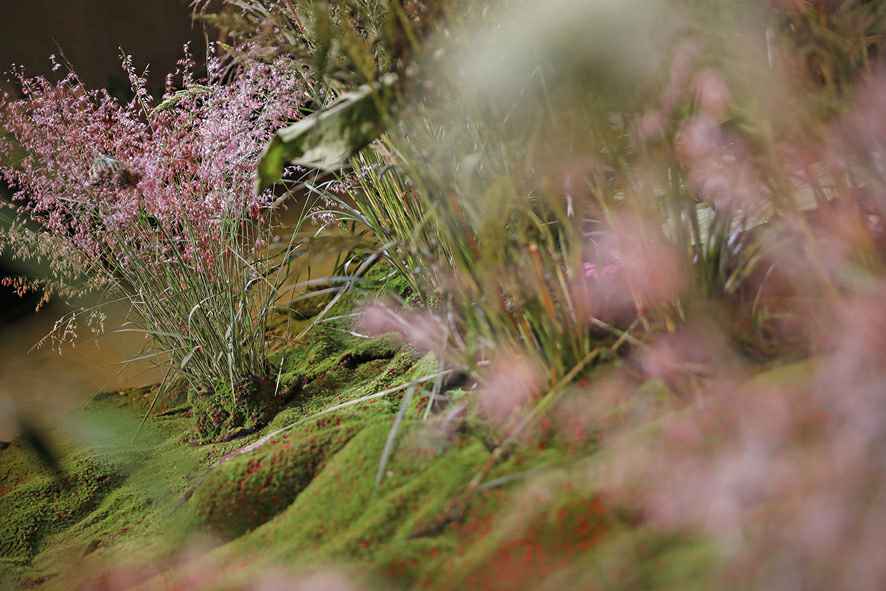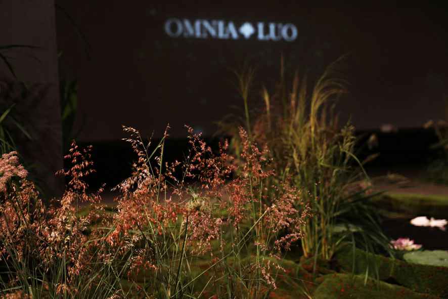 整个秀场以花之秘境的景象为灵感,碧水溪涧的灌木丛林呈现在视野中,葱郁青翠的绿植、野趣静谧的苔藓、恣意绽放的花朵,蜿蜒通幽的曲径,淡烟疏影,闲情自清。